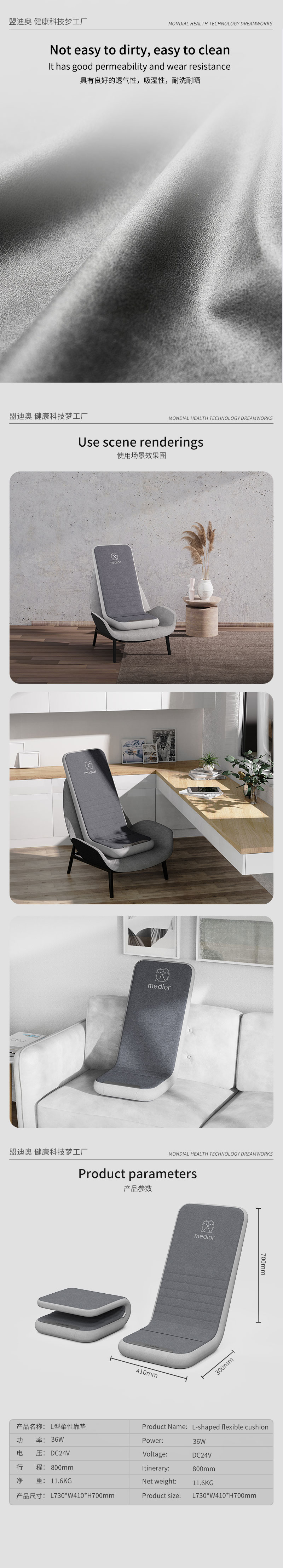 1、L型機芯結構,對折包裝縮小體積2、獨家專利柔性機芯3、力度三檔調節,定點按摩,腰背按摩、臀腿按摩、全背按摩模式選擇4、背部行走揉捏,按摩區域加長到從肩膀到大腿;5、更加貼合不同款式的椅子整體可對折收納6、亞馬遜標準包裝尺寸