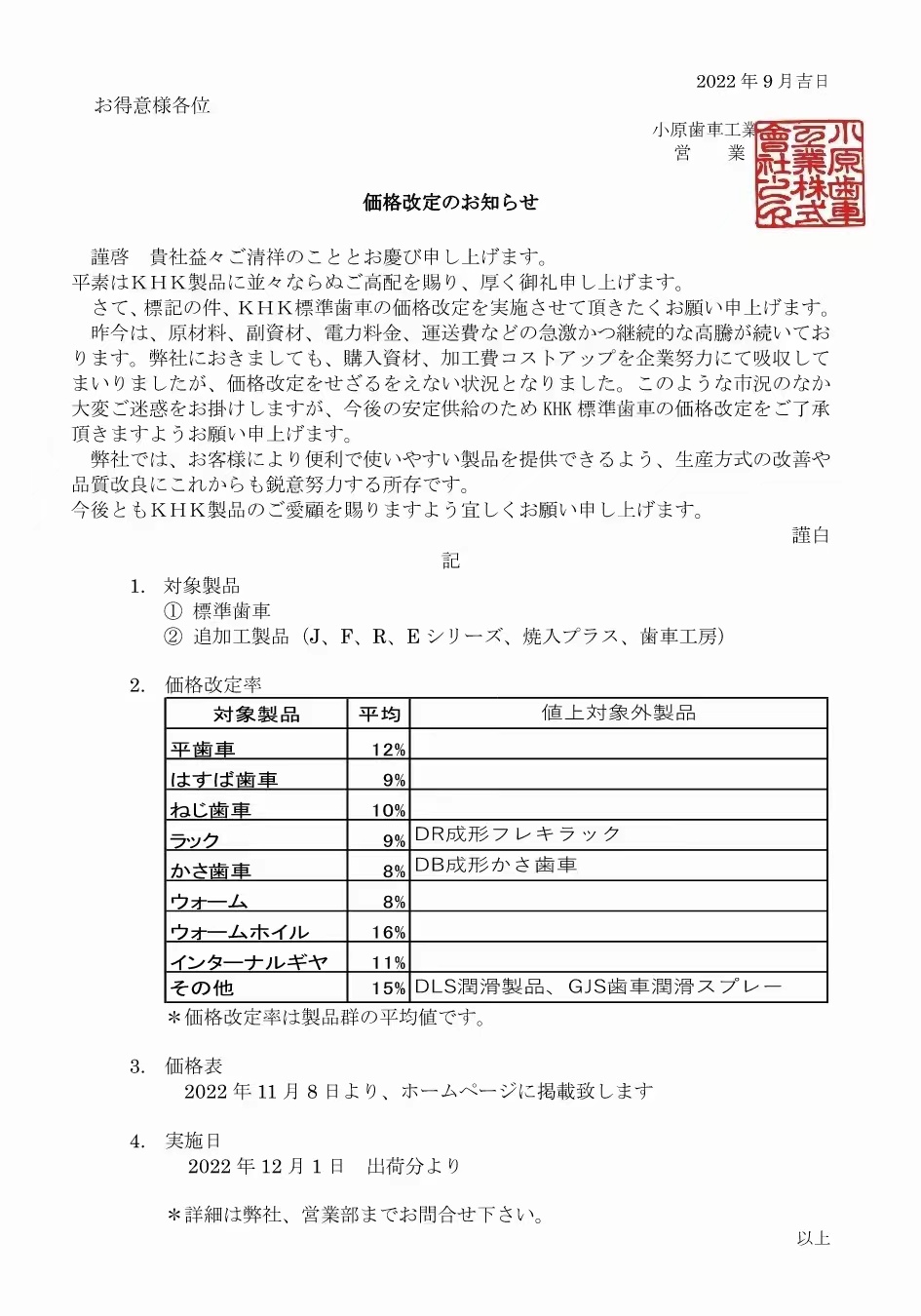 KHK標(biāo)準(zhǔn)品 價(jià)格 變更通知